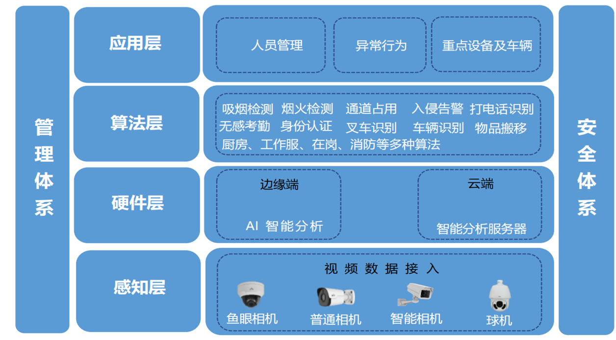 平台以计算机视觉技术为基础,AI 赋能智慧园区,从园区的人、车、物、生产、 质量等多方面出发,针对厂区内的人员、车辆、消防设施、厨房、工作服、在岗 等进行管理,同时对厂区内的异常行为进行分析,从而提升厂区的管理效率和安全。
